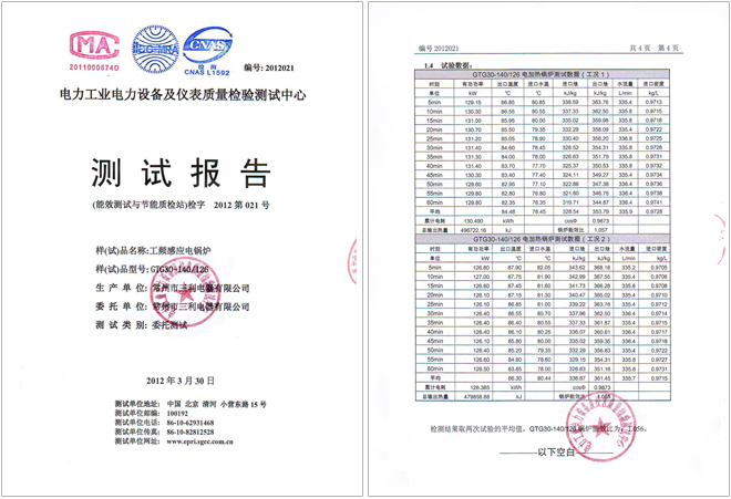 GTG30的能效比經(jīng)中國電力科學(xué)研究院電力工業(yè)電力設(shè)備及儀表質(zhì)量檢驗(yàn)測試中心測試,“電磁鍋爐能效比為:1.056”。