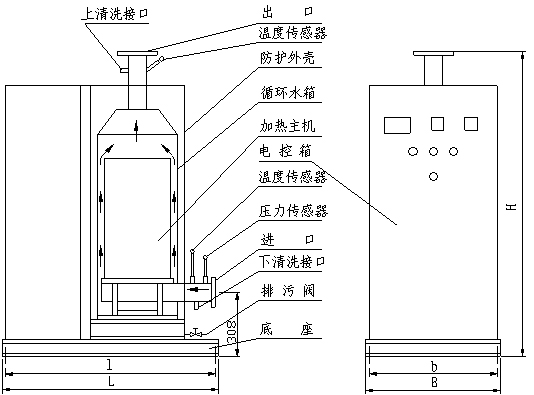 GTG30主要由感應(yīng)加熱的主機(jī)、循環(huán)水箱、防護(hù)外殼組成一體,主機(jī)系一種特殊結(jié)構(gòu)的水冷干式短路變壓器,它設(shè)置在循環(huán)水箱內(nèi)。電鍋爐與PLC電控箱安裝在同一底座上,固定式結(jié)構(gòu),見圖8所示。